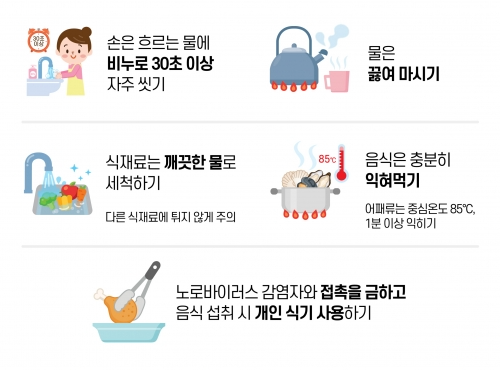 - 음식물 조리 및 보관: 음식물은 충분히 익혀 먹어야 하며, 특히 조개, 굴 등의 해산물은 반드시 익혀 먹어야 합니다. 음식물은 보관할 때는 적절한 온도와 습도를 유지해야 하며, 유통기한을 확인하고, 가능한 한 빨리 섭취해야 합니다.