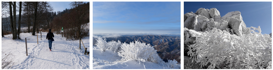 - 눈꽃 산행을 할 때는 혼자 가는 것보다는 동행을 하는 것이 좋습니다. 만약 혼자 가게 된다면, 비상 연락처를 미리 알려 두는 것이 좋습니다.