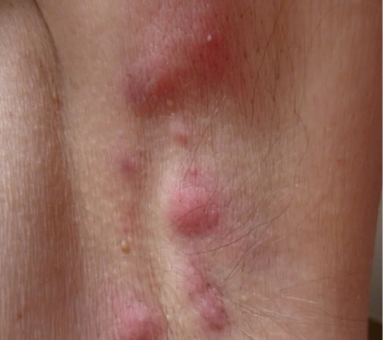 - 1기: 피부에 1~2개의 농양이 생기지만, 농루관이나 흉터는 없는 단계입니다. 농양은 붉은 여드름이나 낭종과 비슷하게 보이며, 누르면 통증이 있습니다.